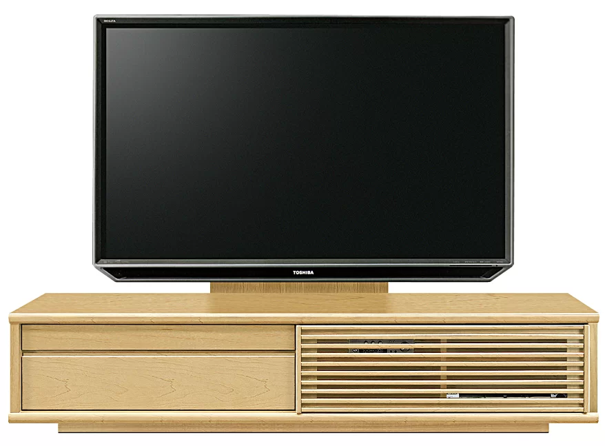 ルーバーを採用し和のテイストを取り入れたモダンなローボードです。右扉は引⼾仕様なので配線作業等で奥まで⼿を入れやすく、扉を開いた状態でも通路の邪魔にもなりません。左扉は上下引出になっており、下はDVD等を、上は小物や説明書等を収納するスペースとして最適です。全体的に柔らかい曲線で仕上げており、優しく空間に馴染みます。