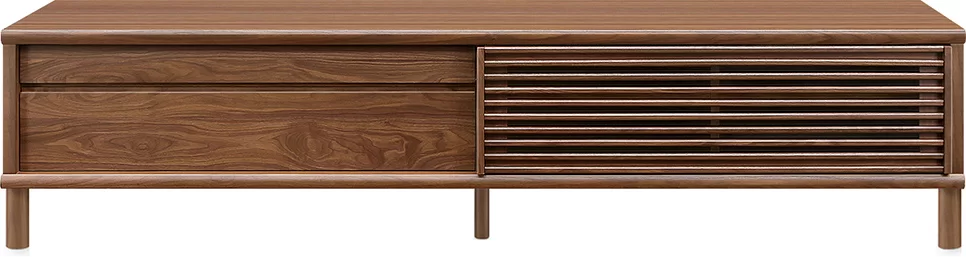 ルーバーを採用し和のテイストを取り入れたモダンなローボードです。右扉は引⼾仕様なので配線作業等で奥まで⼿を入れやすく、扉を開いた状態でも通路の邪魔にもなりません。左扉は上下引出になっており、下はDVD等を、上は小物や説明書等を収納するスペースとして最適です。全体的に柔らかい曲線で仕上げており、優しく空間に馴染みます。