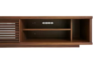 ルーバーを採用し和のテイストを取り入れたモダンなローボードです。右扉は引⼾仕様なので配線作業等で奥まで⼿を入れやすく、扉を開いた状態でも通路の邪魔にもなりません。左扉は上下引出になっており、下はDVD等を、上は小物や説明書等を収納するスペースとして最適です。全体的に柔らかい曲線で仕上げており、優しく空間に馴染みます。