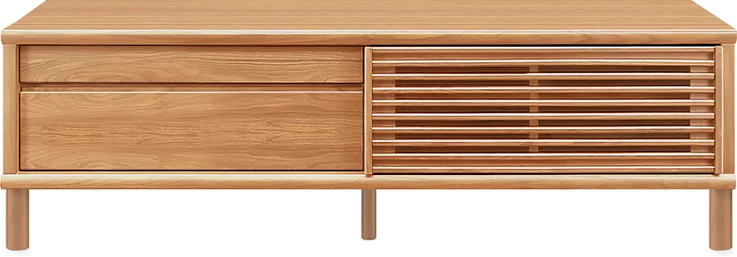 ルーバーを採用し和のテイストを取り入れたモダンなローボードです。右扉は引⼾仕様なので配線作業等で奥まで⼿を入れやすく、扉を開いた状態でも通路の邪魔にもなりません。左扉は上下引出になっており、下はDVD等を、上は小物や説明書等を収納するスペースとして最適です。全体的に柔らかい曲線で仕上げており、優しく空間に馴染みます。
