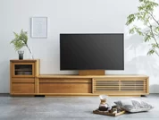 ルーバーを採用し和のテイストを取り入れたモダンなローボードです。右扉は引⼾仕様なので配線作業等で奥まで⼿を入れやすく、扉を開いた状態でも通路の邪魔にもなりません。左扉は上下引出になっており、下はDVD等を、上は小物や説明書等を収納するスペースとして最適です。全体的に柔らかい曲線で仕上げており、優しく空間に馴染みます。