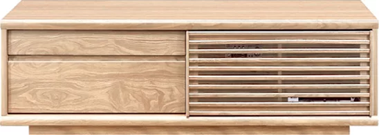 ルーバーを採用し和のテイストを取り入れたモダンなローボードです。右扉は引⼾仕様なので配線作業等で奥まで⼿を入れやすく、扉を開いた状態でも通路の邪魔にもなりません。左扉は上下引出になっており、下はDVD等を、上は小物や説明書等を収納するスペースとして最適です。全体的に柔らかい曲線で仕上げており、優しく空間に馴染みます。