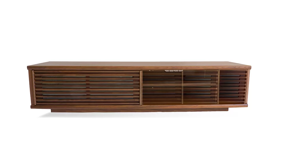 ルーバーを採用し和のテイストを取り入れたモダンなローボードです。右扉は引⼾仕様なので配線作業等で奥まで⼿を入れやすく、扉を開いた状態でも通路の邪魔にもなりません。左扉は上下引出になっており、下はDVD等を、上は小物や説明書等を収納するスペースとして最適です。全体的に柔らかい曲線で仕上げており、優しく空間に馴染みます。