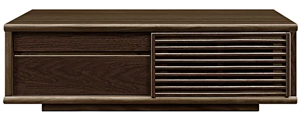 ルーバーを採用し和のテイストを取り入れたモダンなローボードです。右扉は引⼾仕様なので配線作業等で奥まで⼿を入れやすく、扉を開いた状態でも通路の邪魔にもなりません。左扉は上下引出になっており、下はDVD等を、上は小物や説明書等を収納するスペースとして最適です。全体的に柔らかい曲線で仕上げており、優しく空間に馴染みます。