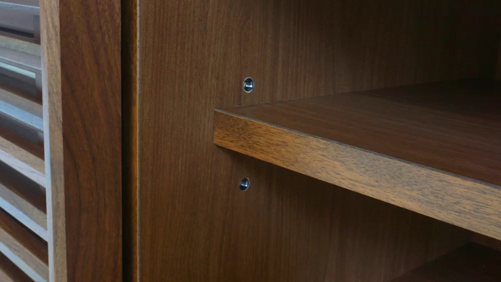 ルーバーを採用し和のテイストを取り入れたモダンなローボードです。右扉は引⼾仕様なので配線作業等で奥まで⼿を入れやすく、扉を開いた状態でも通路の邪魔にもなりません。左扉は上下引出になっており、下はDVD等を、上は小物や説明書等を収納するスペースとして最適です。全体的に柔らかい曲線で仕上げており、優しく空間に馴染みます。