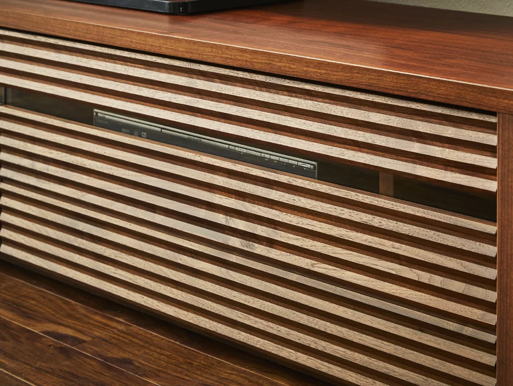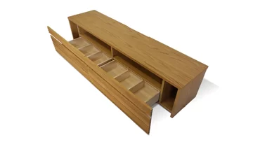 引出し内部にはDVDの背表紙が見えるように立てて収納可能。棚板は可動式で、上にブルーレイデッキなどを置くことができます。