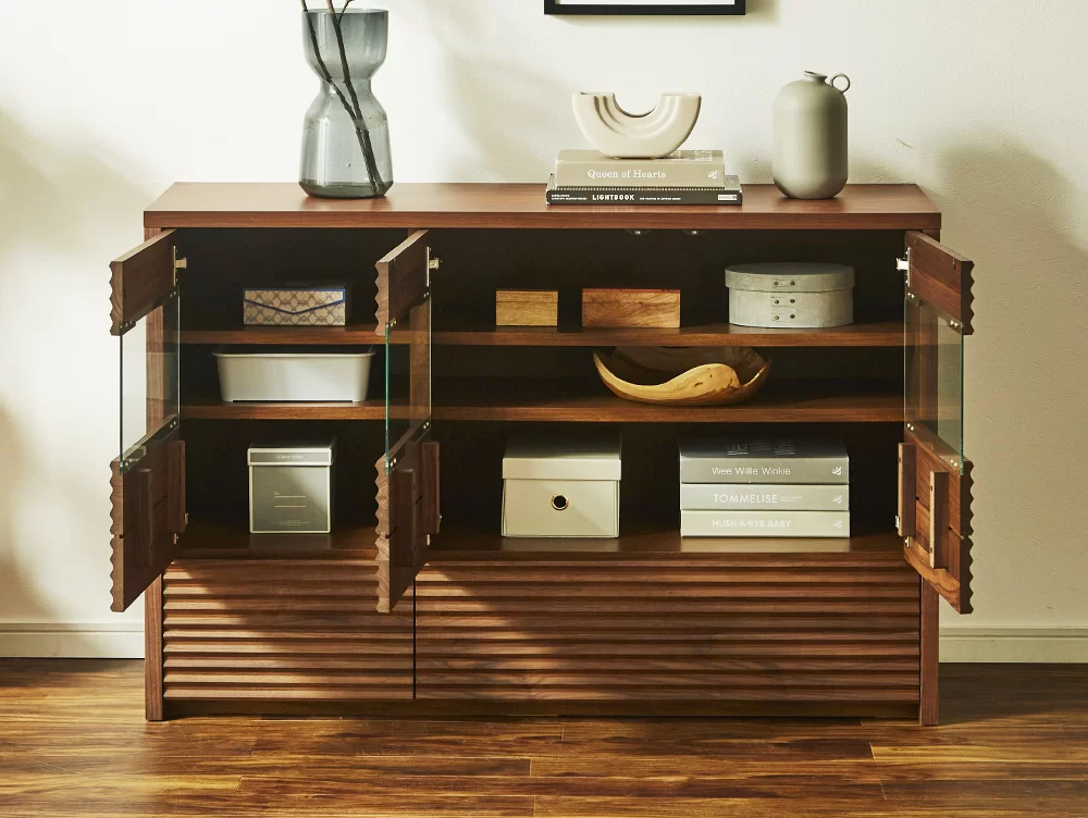 ガラス(強化ガラス)面の割合が大きいため、様々な物を収納し、キャビネットとしてもお使いいただけます。(※画像は 幅120 WN色)