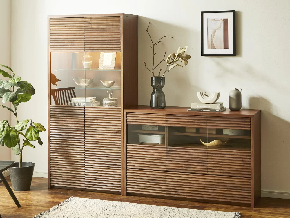 ガラス(強化ガラス)面の割合が大きいため、様々な物を収納し、キャビネットとしてもお使いいただけます。(※画像は 幅120 WN色)