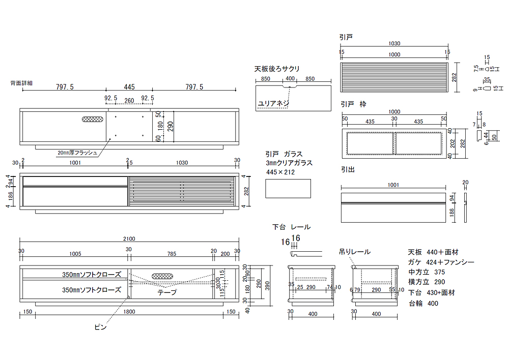 全面にガラスが無く、引出し及び引戸で中が見えない事