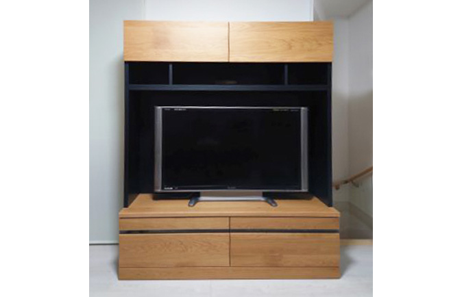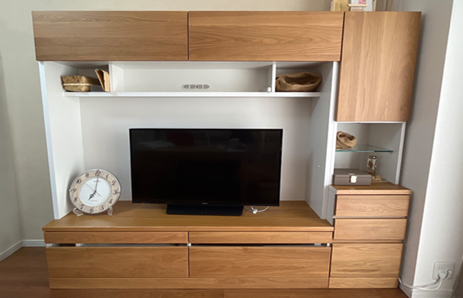 壁面収納型テレビボード(ハイタイプテレビ台)の大川家具設置事例(オークナチュラル)